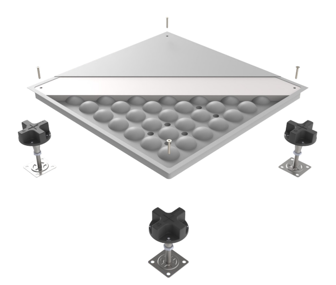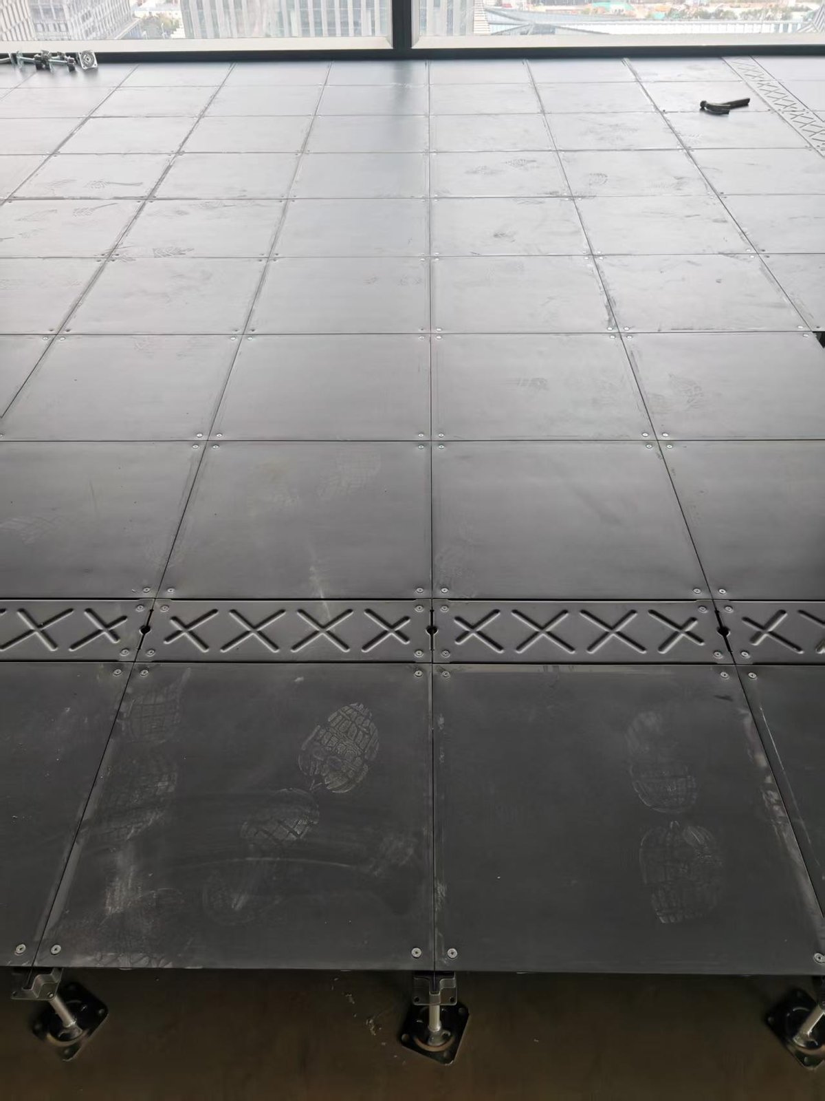 将HUIYA SC800钢质水泥地板逐块就位于支架十字头上,通过螺丝将地板与支架牢固紧固。面板之间的接缝均匀、平整,X形加强筋连接条清晰可见,确保整体结构的稳定性与一体性。