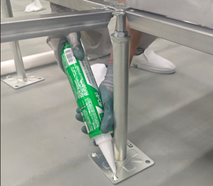 针对上述机房运维痛点,本次项目施工团队在全部地板铺装调平完成后,安排工人进入架空层,对机房内所有支撑底座的固定螺孔及底座接触面,逐一涂抹小西KU928支架专用胶粘剂。胶粘剂施工后,在常温条件下静置固化24小时,使支撑底座与地面基层之间形成稳固的粘接连接结构,将整个支撑体系锁定于精确位置。