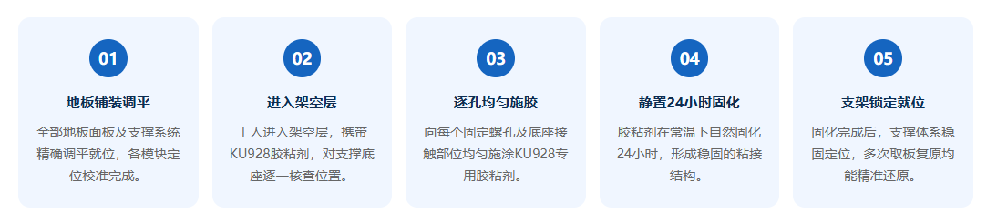 配合日本小西KU928支架专业胶粘剂将支架牢牢固定,即使频繁拆装检修,支架体系始终纹丝不动,地板面板可精准二次复原(详见下文辅材章节)。